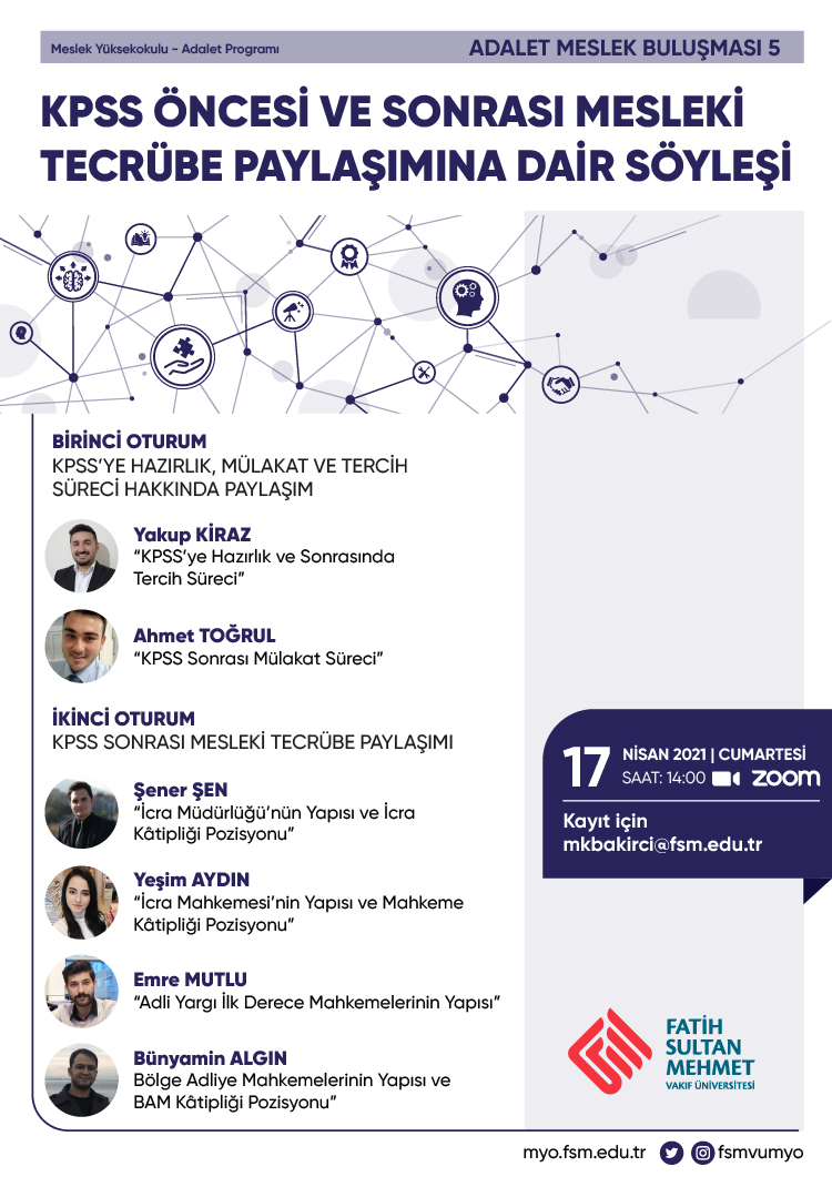 Adalet Programı tarafından düzenlenen "KPSS Öncesi ve Sonrası Tecrübe Paylaşımına Dair Söyleşi" 17 Nisan 2021 Cumartesi günü saat 14.00'te Zoom uygulaması üzerinden gerçekleştirilecektir.