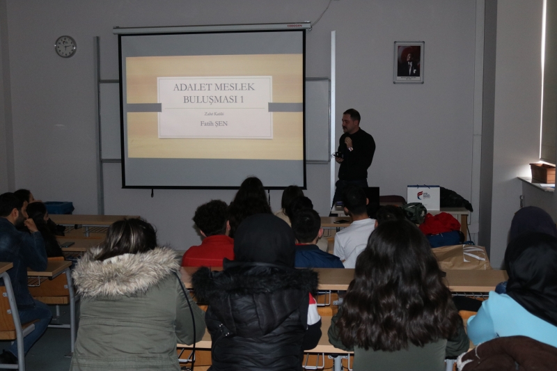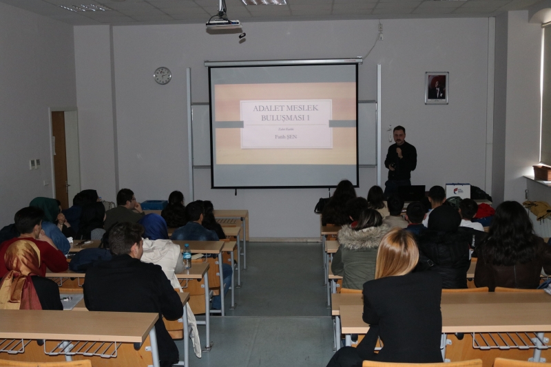 İlk seminer, “Adalet Meslek Buluşması 1” adıyla 09 Nisan 2019 Salı günü Haliç Yerleşkesi A210 numaralı sınıfta gerçekleştirildi. Seminerde, 2017 yılında Fatih Sultan Mehmet Vakıf Üniversitesi Meslek Yüksekokulu Adalet Programından mezun olan ve İstanbul Adliye’sinde zabıt katibi olarak görev yapmakta olan Fatih ŞEN, öğrencilerle buluşarak kişisel tecrübesini paylaştı.