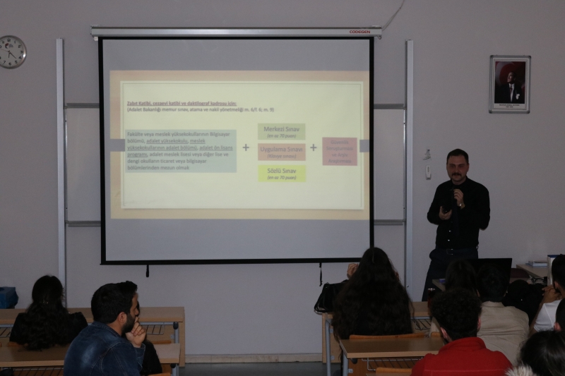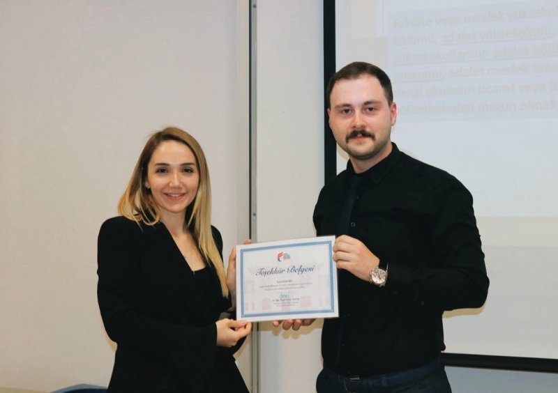 Zabıt katibi olabilmek için aranan koşullar, zabıt katibinin görevleri, hakim ve zabıt katibi ilişkisinin yanı sıra dikey geçiş sınavına dair öğrencilerden gelen soruların yanıtlanmasının ardından teşekkür belgesi takdim edilerek etkinlik sona erdirildi.
