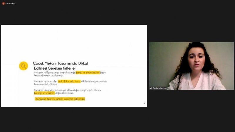 Çocuk ve Mekân, teması bağlamında katılımcı hocalarımız; Doç. Dr. Hatice AYATAÇ ‘Çocuk Dostu Şehir’, Doç. Dr. Yasemin ÇAKIRER ÖZSERVET ‘Mekânda Söz Sahibi: Çocuk’, Öğr. Gör. Seda MAZLUM ‘Çocuk Mekânlarında Güncel Tasarımlar’, Prof.Dr. Esra AKGÜL ve Öğr. Gör. Zehra KURŞUN ‘Kapsayıcı Eğitim Ortamları’ konularında değerli paylaşımlarda bulundu.