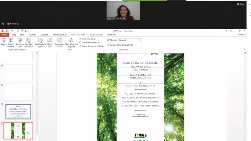 Program, Meslek Yüksekokulu müdürümüz Sn. Dr. Öğr. Üyesi İlhami DANIŞ tarafından düzenlenen teşekkür belgesi, konuşmacı adına TEMA Vakfı aracılığıyla İzmir Bademli Ormanı’nda dikilen fidan dikimi sertifikası, konuşmacı adına Türk Kızılay’ ın yürüttüğü “Uzaktan Eğitime Yakın Destek” projesine yapılan bağış sertifikasının konuşmacıya takdimi ile son buldu.