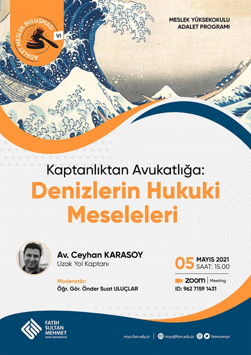 Fatih Sultan Mehmet Vakıf Üniversitesi Meslek Yüksekokulu Adalet Programı tarafından düzenlenen ve Uzakyol Kaptanı Av. Ceyhan KARASOY’ın konuşmacı olarak katıldığı "Kaptanlıktan Avukatlığa: Denizlerin Hukuki Meseleleri" adlı söyleşi programı 05 Mayıs 2021 Çarşamba günü gerçekleştirildi.