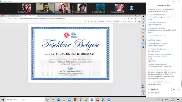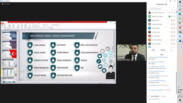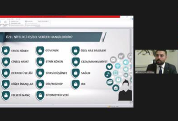 Sayın KORKMAZ, KVKK kapsamında gerçek kişilerin dikkat etmesi gereken unsurlardan bahsederek, bu kanun kapsamındaki cezai sorumluluklar hakkında detaylı bilgiler verdi. Öğr. Gör. Esra ÇALIK BAYAZIT moderatörlüğünde ve 165 katılımcı ile gerçekleştirilen eğitim Sayın KORKMAZ’a katılımlarımdan ötürü Teşekkür Belgesi ve Fidan Bağış Sertifikasının takdimi ile sonlandırıldı.