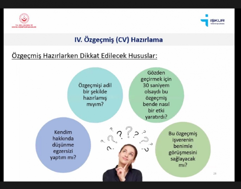 Öğr. Gör. Esra ÇALIK BAYAZIT'ın moderatörlük yaptığı etkinlikte Beyoğlu İşkur İşkulubü Meslek Danışmanı Gökhan KAYABAŞI tarafından CV hazırlama, mülakat teknikleri, işsizlik ödenekleri, işbaşı eğitim olanakları, kariyer imkanları gibi konular sunuldu. Etkinlik katılımcımıza teşekkür belgesinin takdimi ile sonlandırıldı.