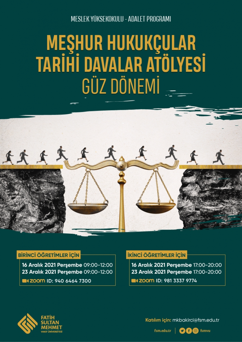 Fatih Sultan Mehmet Vakıf Üniversitesi Meslek Yüksekokulu Adalet Programı Medeni Hukuk Bilgisi dersi kapsamında geçtiğimiz yıl olduğu gibi bu sene de Meşhur Hukukçular/Tarihi Davalar Atölyesi’nin Güz Dönemi etkinliği, 16 Aralık ve 23 Aralık 2021 tarihlerinde iki oturum şeklinde hem online hem yüz yüze ortamda hibrit model kullanılarak gerçekleştirildi. Bu atölye, öğrencilerimizin, arkadaşları ile kurdukları veya tek kişilik ekipler şeklinde, kendilerinin araştırdıkları ve sunmayı uygun gördükleri meşhur hukukçulardan birini veya tarihe damgasını vurmuş olaylardan birini görsel ve/veya işitsel materyalleri kullanarak katılımcılara sunduğu bir etkinliktir.