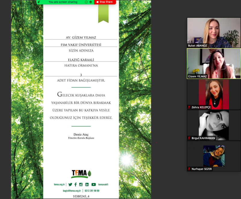 Öğr. Gör. Buket ABANOZ ÖZTÜRK’ün moderatör olduğu programda, yapay zeka hukuku ve etik konusunda çalışmalar yürüten Av. Gizem YILMAZ konuk edildi. Program kapsamında hukuk alanında kullanılan yapay zeka teknolojilerinden örnekler verildi. İçtihat tarama programlarında, bilirkişilik programlarına, ilk robot avukat asistanı olarak bilinen Ross’un kullanımından, yargılama sırasında bir kişinin tutuklanmasına veya salıverilmesine karar verilirken kullanılan algoritmalara ve robot hakimlere kadar birçok yapay zeka teknolojisi kullanımında etik tartışmalar ortaya koyuldu. Bu kapsamda bir görüşün insanlara özgü ahlaki değerlerin kodlanabilecek şeyler olmadığını ve roboetik kavramının savunulamayacağını ileri sürerken; diğer görüşün robotların insanlardaki fiziksel ve duygusal nedenlerden kaynaklanan ön yargılardan, yorgunluk-açlık gibi fiziksel etkenlerden veya muhakeme bozukluklarından arındırılmış olması nedeniyle herkese eşit ve adil bir değerlendirme yapabileceğini savunduğu belirtildi. Yapay zekanın yargılamada kullanılırken tabi olacağı kuralların belirlenmesi için oluşturulan İşbirliği Bildirgesi ve Yapay Zeka Etik Şartı düzenlemelerinde ilkeler ortaya koyuldu. Program konuşmacı adına TEMA Vakfı aracılığıyla Elazığ Karaali Hatıra Ormanı’nda dikilen fidan dikimi sertifikalarının takdimi ile sonlandırıldı.